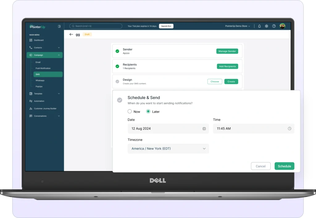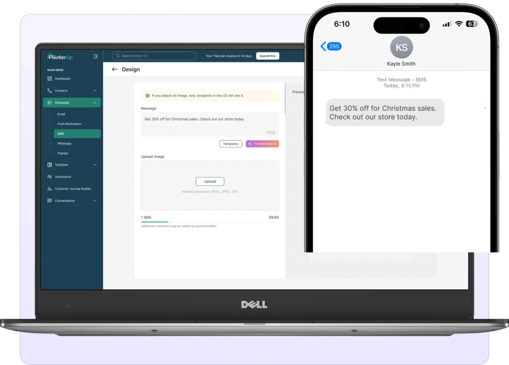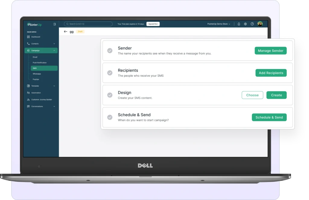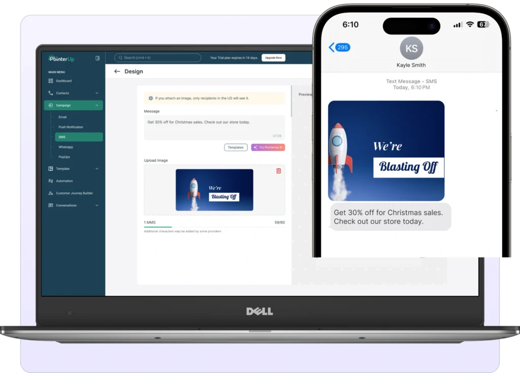 Automate Your SMS Campaigns & Boost Engagement The SMS Automation to help businesses connect with customers instantly through personalized, automated SMS campaigns. Whether it’s sending transactional updates, SMS automation ensures fast and reliable communication. Start 14-day free trial Key Features of SMS Automation Rich Media Support Send images and message to enhance user experience and drive better engagement. Personalization messaging Customize messages with dynamic fields like Message and Image to create a more personalized experience. Scheduling & Smart Delivery Schedule messages in advance and delivery optimization to send them at the best time for maximum engagement. Pre-Build Templates Send critical alerts, OTPs, order confirmations, delivery updates, and payment reminders to keep users informed. Drip Campaigns Automate SMS sequences for onboarding, reminders, promotions, and re-engagement to nurture leads and customers effectively. Automate Your SMS Campaigns & Boost Engagement Start 14-day free trial